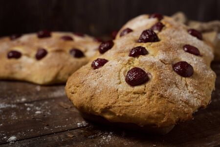 closeup of some coca de cireres, a cherry sweet flat cake typical of Catalonia, Spain, typically eaten on Corpus Christi feast, on a wooden table
