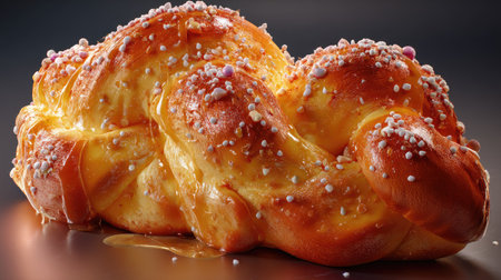 A beautifully twisted sweet bread featuring a glossy golden glaze, adorned with colorful sprinkles, perfect for special occasions and celebrations.