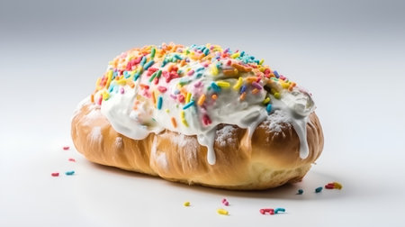 Delicious glazed donut with colorful sprinkles served on a bright surface