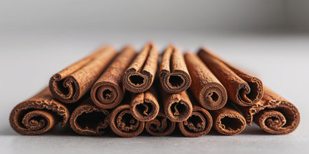 AI Generated. A close up view of several cinnamon sticks arranged in a pile