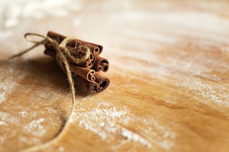 Cinnamon sticks, tied with jute rope on old wooden background in rustic style