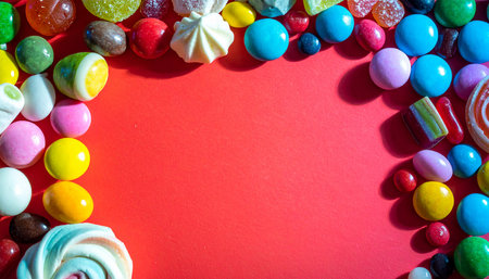 A vibrant frame of assorted colorful candies and sweets on a bright red background, creating a playful and sweet border.