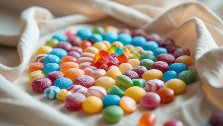 AI Generated. Colorful Candies Arranged in a Fan Shape on Beige Fabric