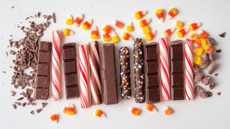 A whimsical arrangement of candy canes, chocolate bars, and candy corn, displayed on a white background, perfect for highlighting holiday or seasonal sweets.