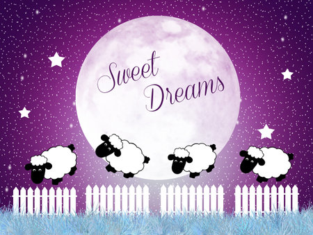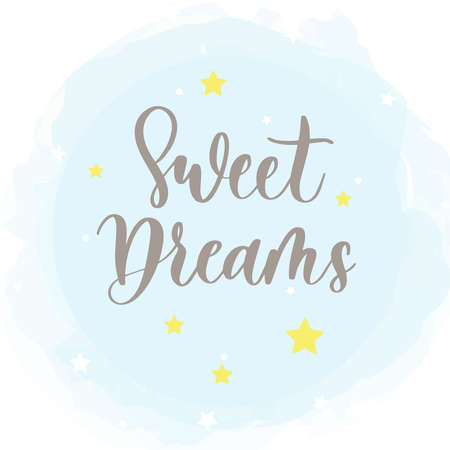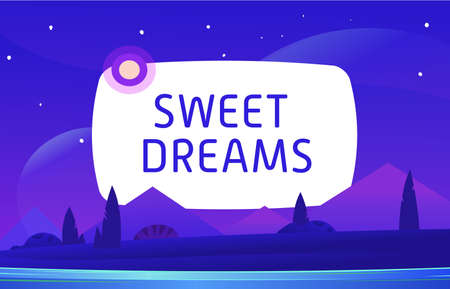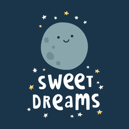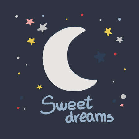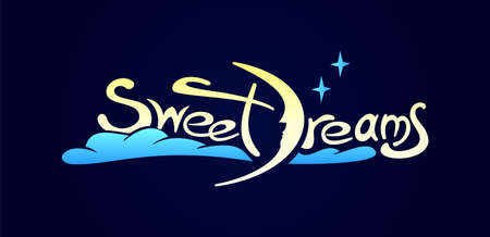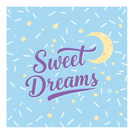 Vector illustration features purple Sweet Dreams text with crescent moon and yellow stars on a blue background, creating a calming nighttime mood.