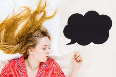 Teenage sleepwear fashion concept. Young woman lying on bed wearing cute pink pajamas, black thinking or speech bubble next to her.
