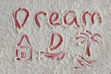 Word dream and pictures of home, boat, palm on flour background