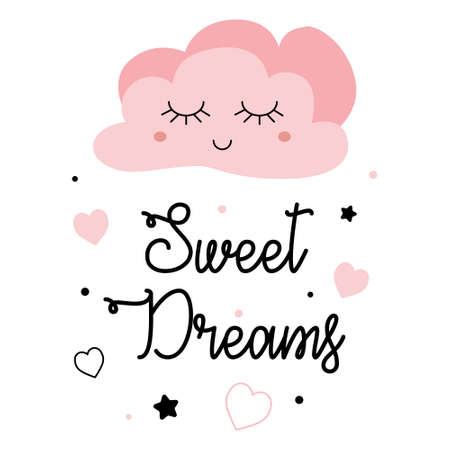 Vector background with cute smiling cloud, stars and beautiful typography Sweet dreams. Childish card with cartoon character and text