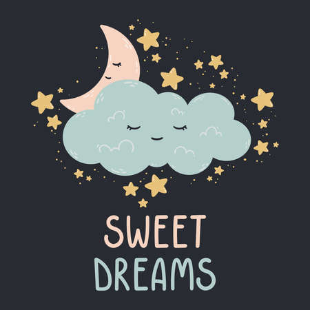 Cute poster with moon, stars, cloud on a dark background. Vector print for baby room, greeting card, kids and baby t-shirts and clothes, womenswear. Sweet dreams hand drawn nursery illustration.