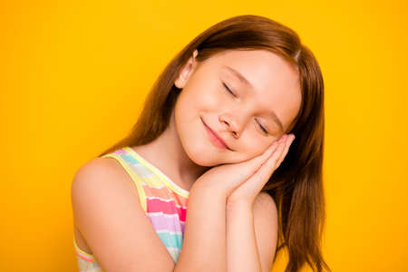 Close up photo of pretty child closing eyes sleeping wearing singlet isolated over yellow background
