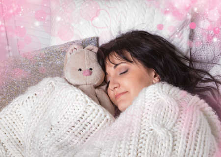 Girl sleeps in a bed with a toy a teddy bear with valentines decor