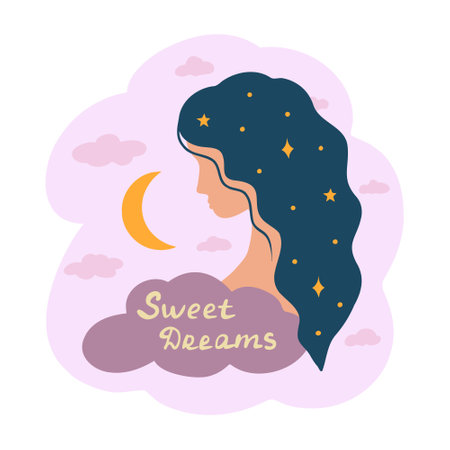 Girl night, hair is star sky, sweet dreams lettering. Vector Illustration for backgrounds, covers and packaging. Image can be used for greeting card, poster and textile. Isolated on white background.