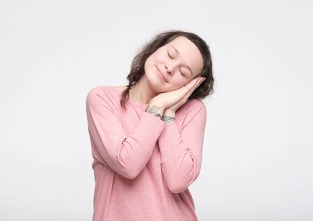 Pretty pleased caucasian woman in pink clothes is bored leaning at hands dreaming and naping. Studio shot
