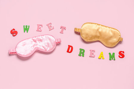 Composition with stylish sleep masks and text SWEET DREAMS on color background