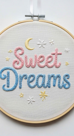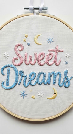 A round embroidery hoop featuring Sweet Dreams text in pink and blue, with stars, a moon, and flowers in an inspirational design.