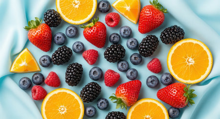 Assortment of vibrant fresh strawberries, blueberries, raspberries, blackberries, and orange slices. ideal for healthy eating, diet, and natural vitamin concepts.