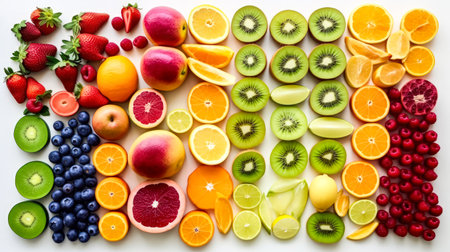 Colorful mix of fresh berries, citrus slices, and grapes, neatly arranged against an isolated background