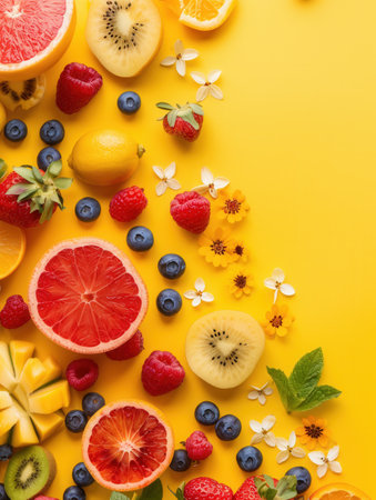 A colorful collection of assorted fruits and fragrant flowers arranged beautifully on a sunny yellow backdrop, ideal for summer.