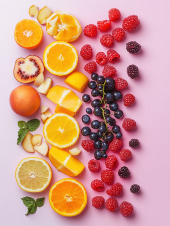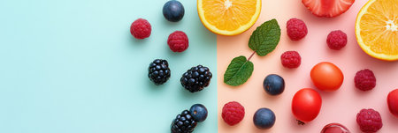 A vibrant array of fresh fruits and berries is artistically arranged against a soft pastel background, showing a clean and minimal aesthetic.