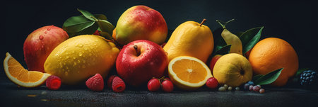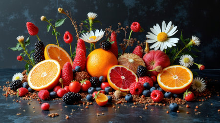 Vibrant assortment of fresh fruits with daisies on dark background. That the image is generated using AI.