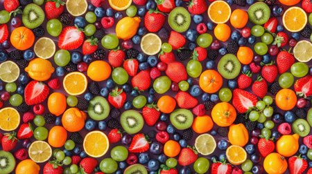 Neatly arranged fresh fruits like berries, citrus, and grapes, forming a vibrant, isolated seamless pattern