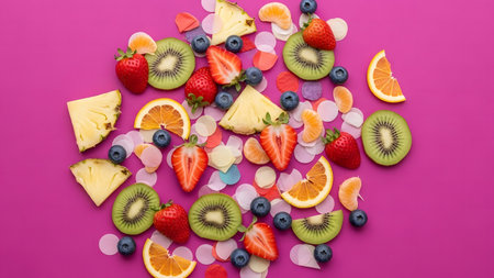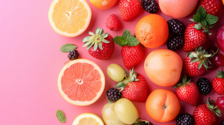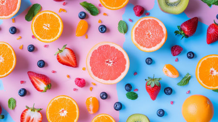 Assorted fresh fruits arranged on a colorful pink and blue background. The vibrant composition includes oranges, strawberries, blueberries, and mint leaves, perfect for a fresh and healthy theme.