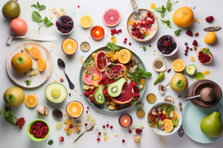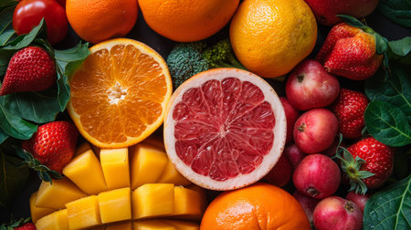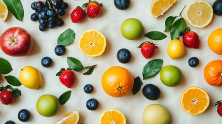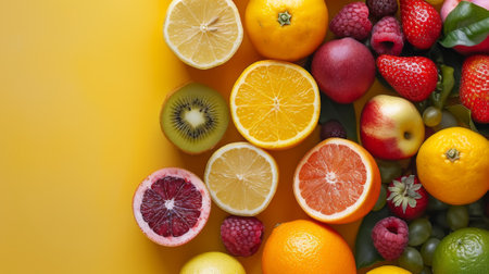 Overhead shot of a selection of fresh fruits, arranged in a flat lay style, with a focus on the vibrant colors and textures of each fruit