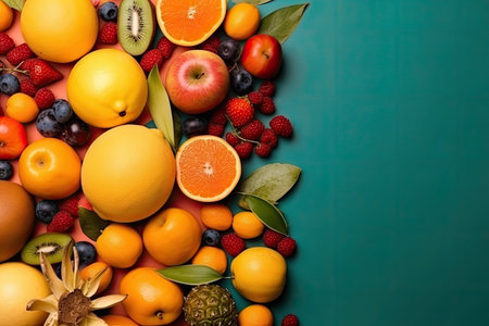 Variety of fresh fruits and berries as a background, top view. ai generated