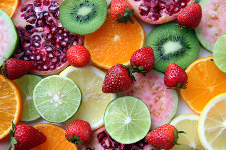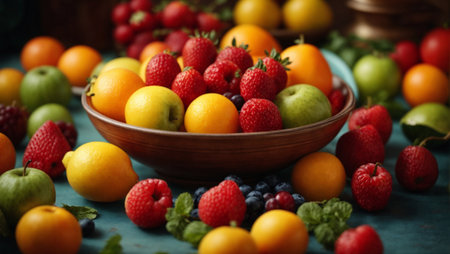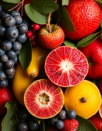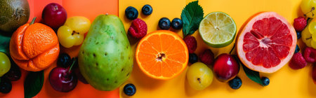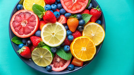 Assorted fresh fruits including citrus and berries on a colorful background, highlighting their vibrant colors and freshness.