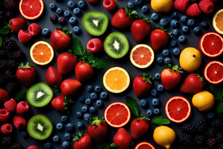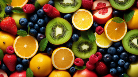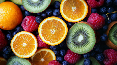A close-up of an assortment of fresh fruits, including sliced oranges, kiwis, raspberries, and blueberries, showcasing vibrant colors and healthy natural produce.