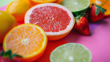 A vibrant assortment of citrus fruits and strawberries arranged on a colorful background, highlighting their freshness and juicy appeal.