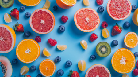 A vibrant arrangement of fresh citrus fruits and berries on a blue background, highlighting their freshness and color, suitable for healthy eating and vibrant nutrition themes.