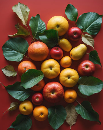 AI Generated. Fresh fruits arranged on a vibrant red background with green leaves in autumn setting