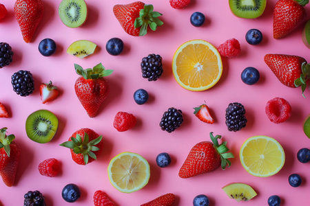 Strawberry, blueberry, kiwi, lemon, lime on pink background