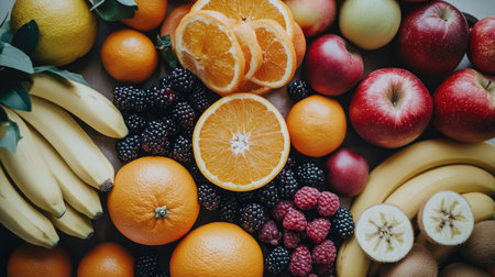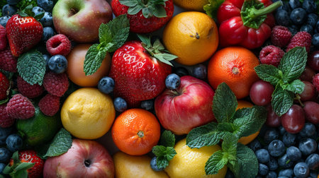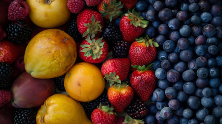 Top view of assorted fresh fruits and berries. Perfect for healthy eating, fresh produce, and summer themes.