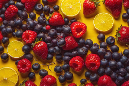 Variety of fresh fruits including raspberries, strawberries, blueberries, lemons and oranges