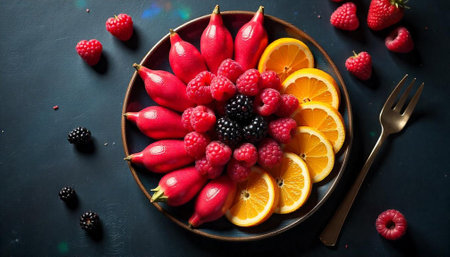 A close-up showcases a plate filled with vibrant slices of oranges, limes, and lemons, accented by raspberries, blackberries, and blueberries. The composition features a variety of colors, textures, and shapes, illuminated by natural sunlight, suggesting a healthy eating concept with potential uses in wellness promotions.