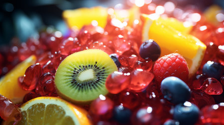 A close-up of a vibrant assortment of fresh fruits and colorful jelly candies.