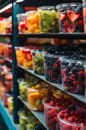 An array of vibrant fruits in clear cups displayed on dark shelving, highlighting red strawberries. Emphasizes a wholesome and inviting selection. High quality photo