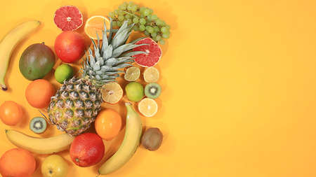 Detox diet and weight loss concept. summer tropical fruits and vegetables on a yellow table, top view, healthy and natural food, source of vitamin C, store banner, selective focus,