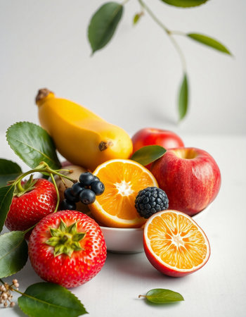 Wholesome arrangement, Fresh and vibrant fruits artfully displayed on a clean white background. A captivating concept for healthy and nutritious eating.
