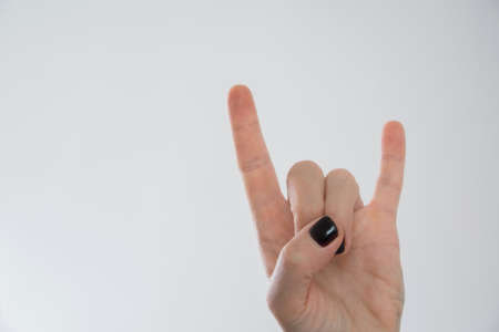 Isolated woman hand in rock and roll gesture sign, white background with space for text