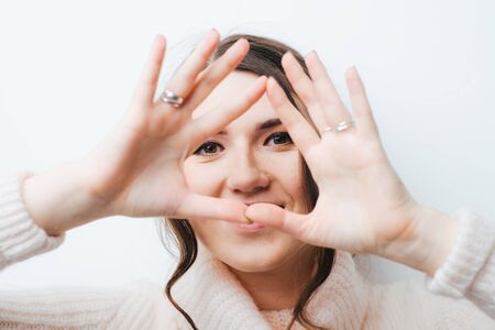 on a white background girl makes a frame arms