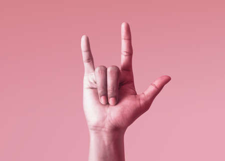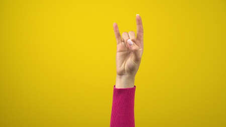 Female hand shows the sign of the horns. Studio photography on an isolated yellow background.