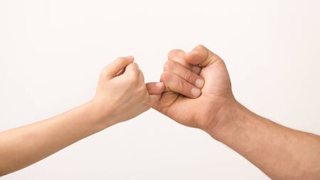 Friendship concept. Father and daughter hand making promise holding little fingers, isolated on white background
