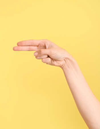 Woman's Hand gesture with V sign for victory or peace on yellow background