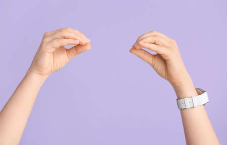 Young deaf mute women using sign language on color background