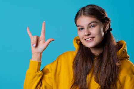 A beautiful young brunette in a yellow oversize hoodie shows a rock gesture, two fingers up, its cool, portrait on a blue background