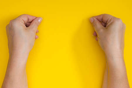 Hands with clenched fingers in a pinch on a yellow background