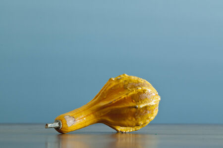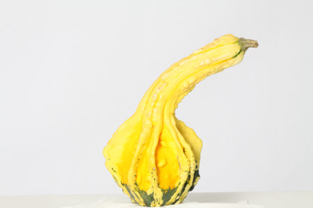 Isolated yellow, (a little green on the bottom), Ornamental Gourd, against a light colored back ground.